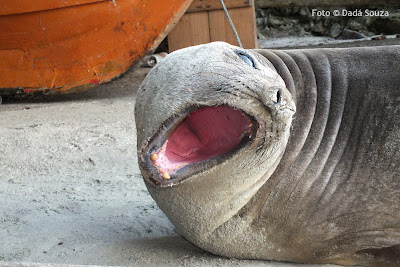 Um filhote de elefante marinho descansando junto aos barcos de pesca,